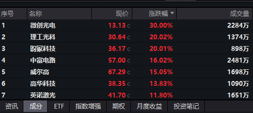 今日老虎配资,电子元器件板块表现亮眼,板块内多只个股冲击涨停,其中微创光电拿下“30CM”涨停,理工光科、昀冢科技收获“20CM”涨停。