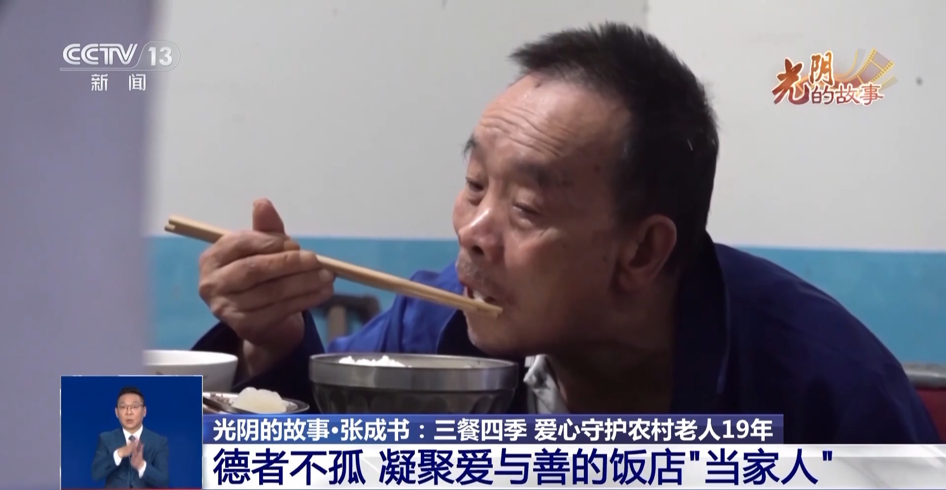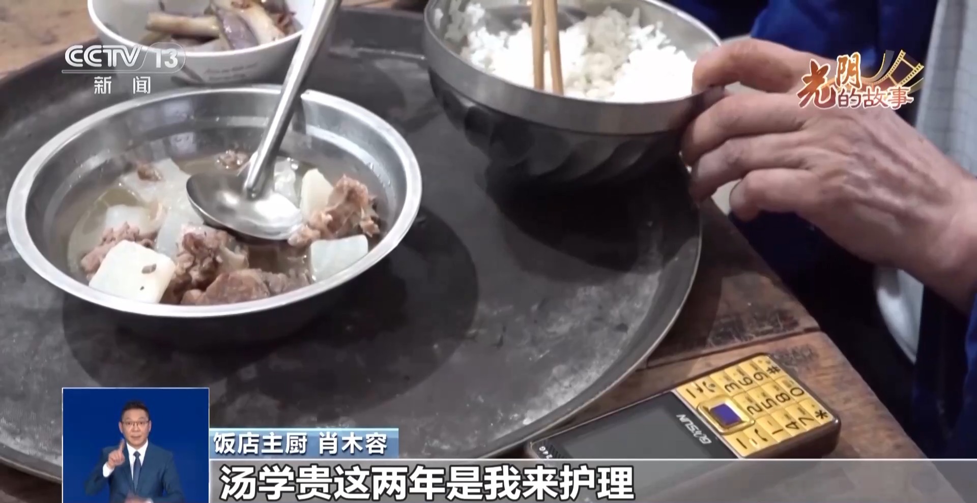 主厨肖木容从十八年前就开始在大桥饭店工作,除了准备一日三餐以外,她还要给腿脚不便的老人汤学贵送餐。汤学贵因为脑血栓,生活无法自理,儿子在外打工,一年多前,张成书便安排肖木容来照料他。为此,她还给肖木容涨了工资。